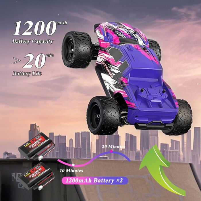 - 2.4GHz Remote Control: The radio control system is enough to achieve stable control within 70 meters, and the interference-free remote control supports multiple cars racing in the same field. The full scale throttle/steering can realize speed change, support high speed driving, rapid acceleration, deceleration, braking, reversing and left/right steering. It comes with two 7.4V 1200mAH rechargeable lithium ion batteries for long time use.
