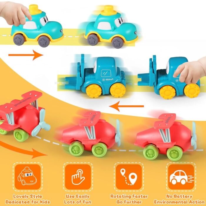 Vibrant Colors & Realistic Details: Our truck toys feature bright, attractive colors that capture children’s attention and help in color learning. The realistic designs and rolling wheels make the play more authentic. The compact and lightweight size of these toy cars makes them perfect for little hands to grasp, push, and move around easily on any surface.