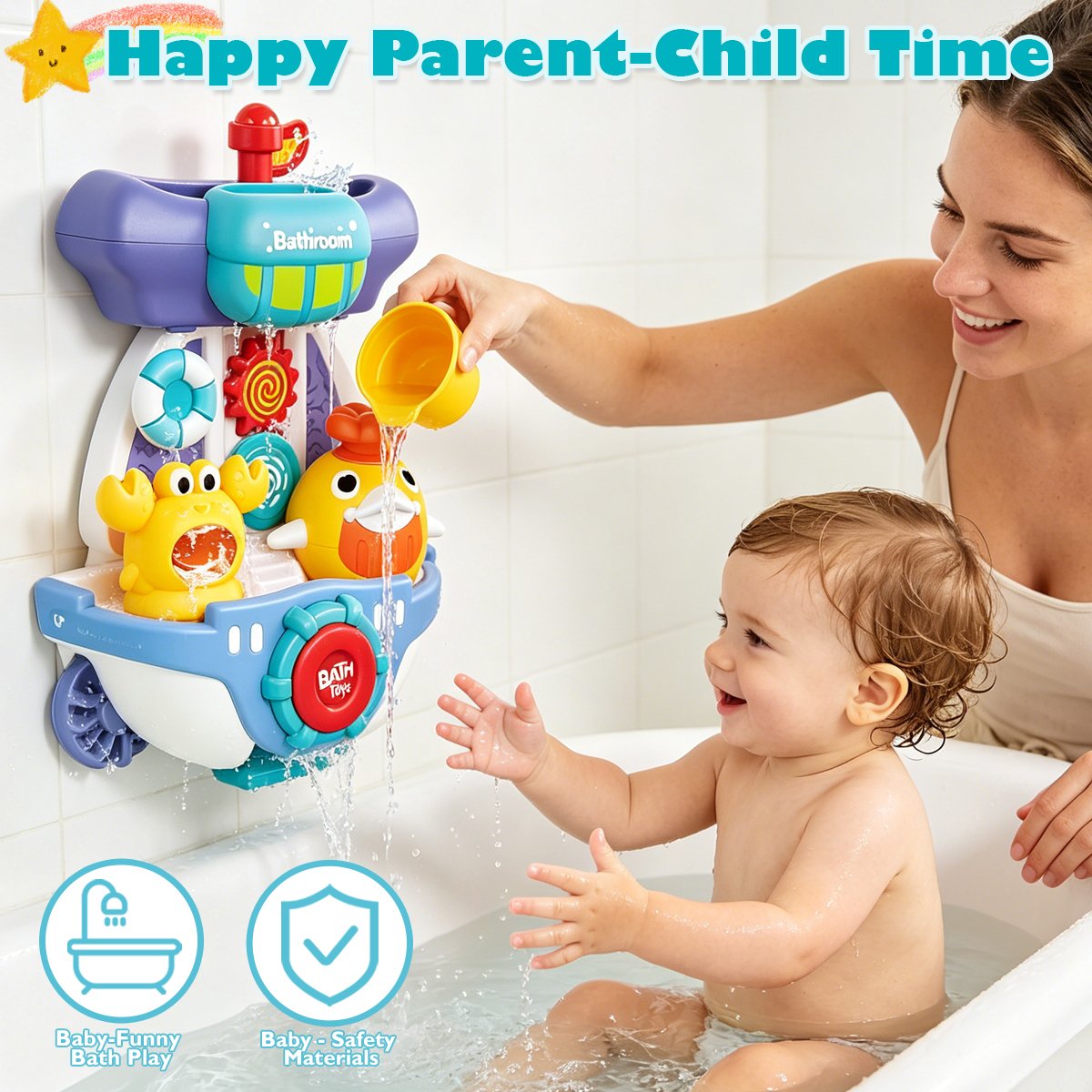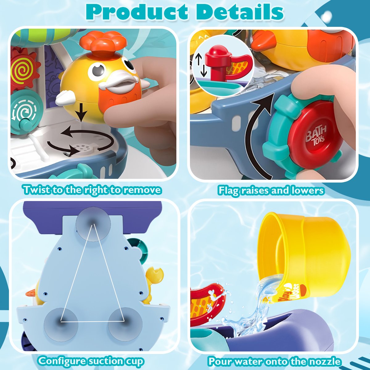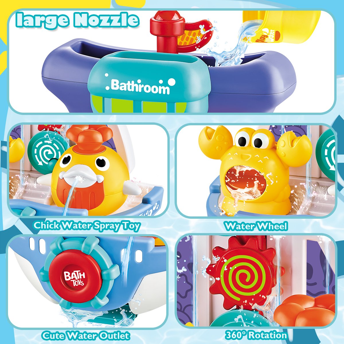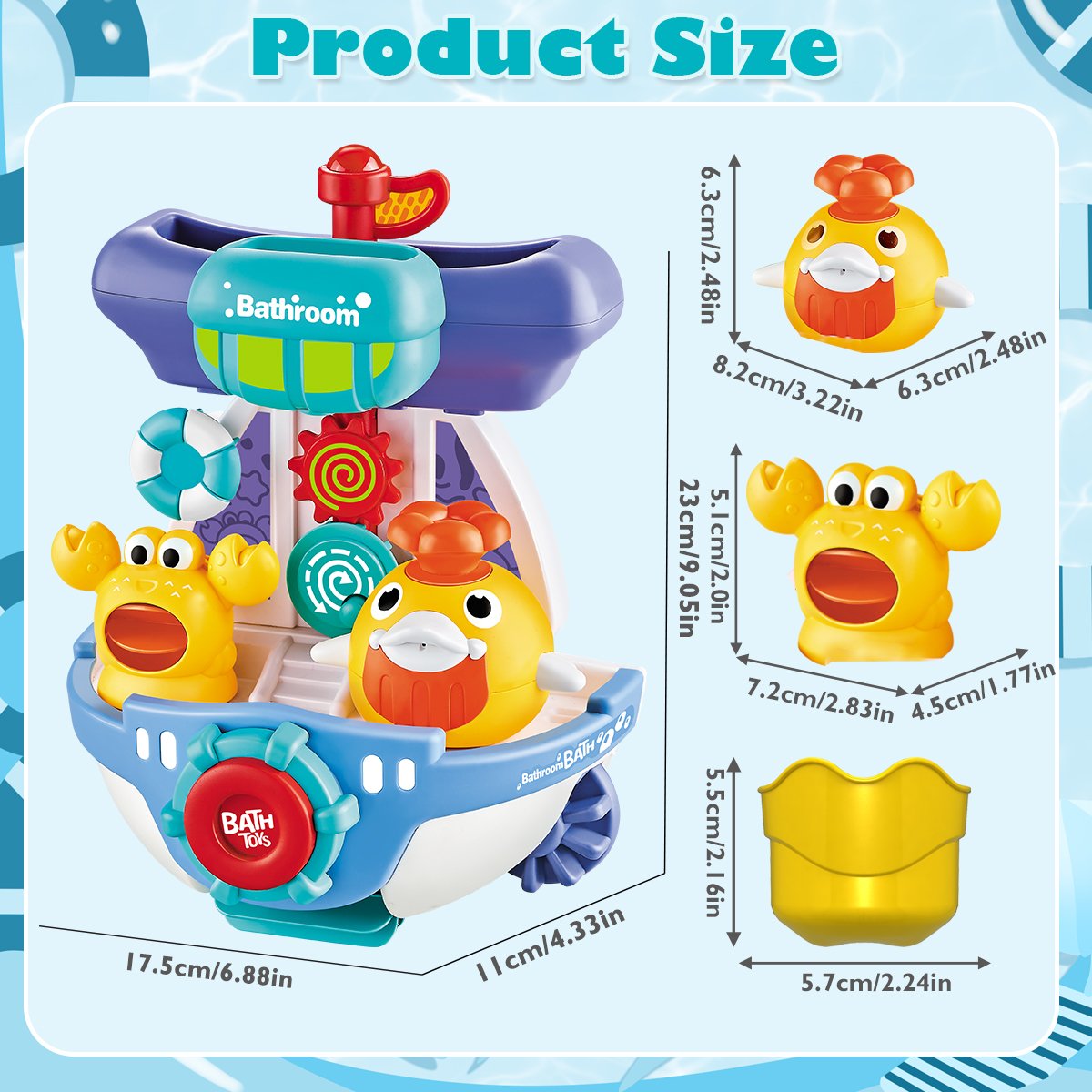 - Baby Bath Toy: This bath toy has a cartoon appearance design, cute shape, and strong playability, which will bring happy bath time to 2,3,4 year old kid. Pour water onto the faucet above the toy, and the water will splash down. Every splash will create a miracle, turning bathing time into an immersive sensory adventure! It is equipped with fun little chicken water spray toys and spinning crab toys, as well as a small cup.It is an ideal bath/pool toy.