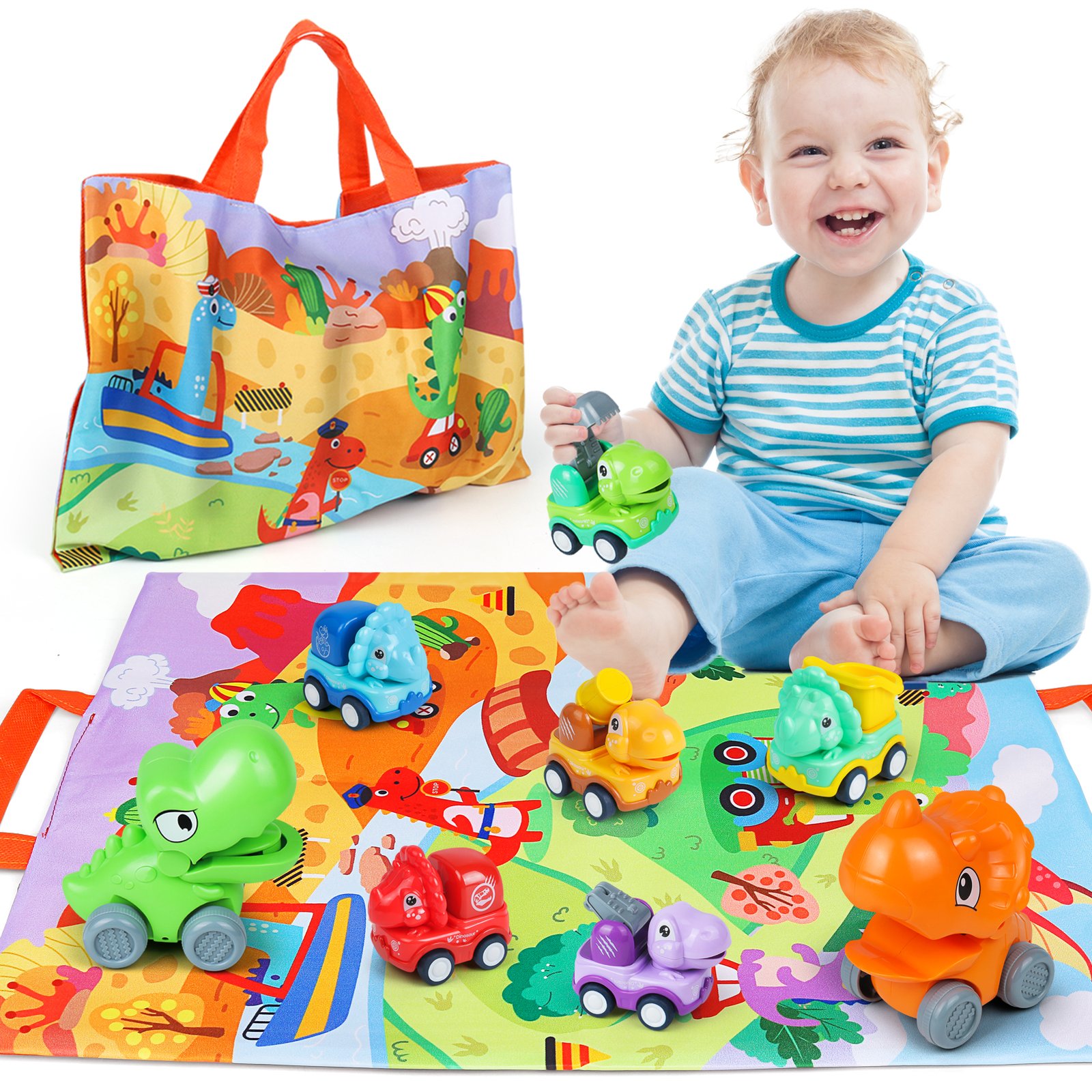 - This is a playmat that combines gaming and storage functions with cute dinosaur themed scenes, with a soft texture that is no easily wrinkled. It can be expanded to allow baby to sit on it and simulate a dinosaur world with a small car. Closing it is the storage bag for storing the small car, cultivating the baby’s storage ability. This is an great travel baby car toy set for toddlers 1-3.