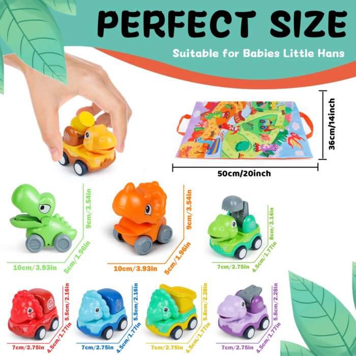 - 8 pack dinosaur truck toys, each dinosaur car is designed with movable joints adn interesting movements that baby can’t help but explore, which is a small surprise we are prepared to give to the kids.