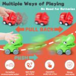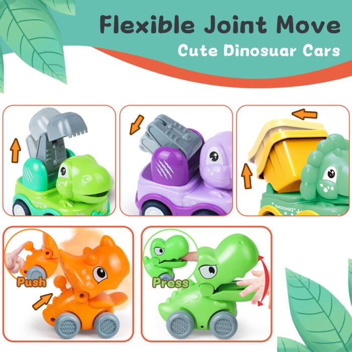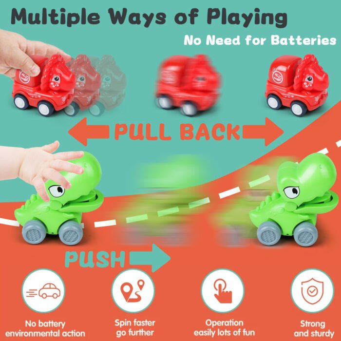 - This dinosaur friction toy car has multiple forward modes, all of which do not require batteries. 6 mini dinosaur cars with pull back function only need to be pulled backwards and then released, and they will run forward one by one! The other 2 big dino truck can be pushed forward in a fun and simple way. Choose your baby’s favorite dinosaur and start the competition!