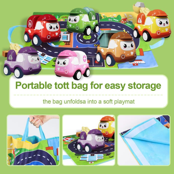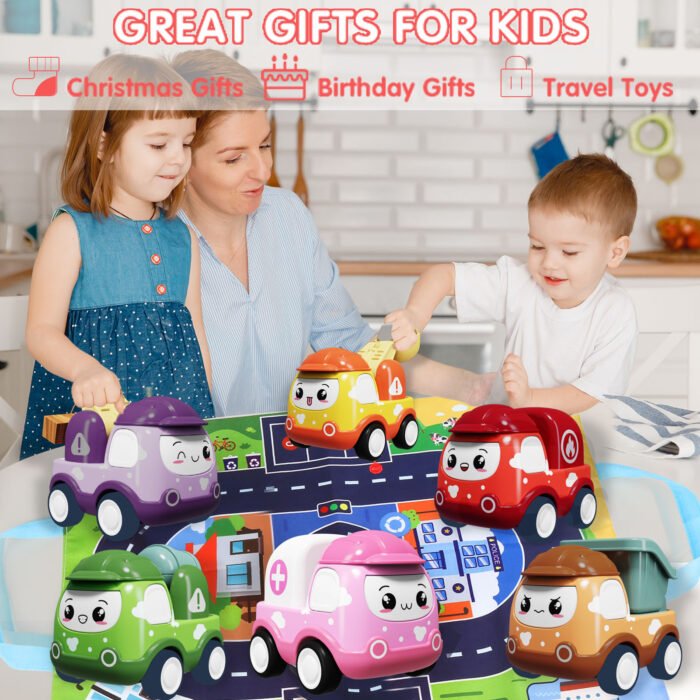 🚑🚓🚒🚕🚌Pull Back Cars for Toddlers are 6PCS friction powered pull back cars, plus a play mat that integrates play and storage functions.Each car has a different color and expression that can stimulate baby visual development. This toy set can make little construction truck lovers fully utilize their imagination and creativity, and promote their divergent thinking.Baby party favors birthday gifts for kids!