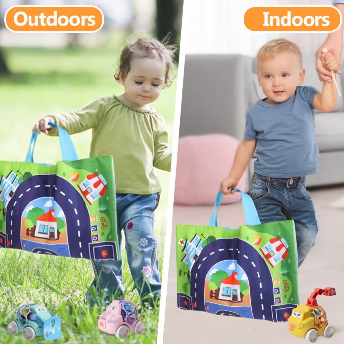 - The push and pull cars for toddlers includes city street map. With a 19*14 inch multifunctional play mat which a city street printed on, made of soft wrinkle resistant fabric. Kids can sit on a simulated urban traffic scene, let their imaginations run. It also folds up into a storage pouch, making it easy to fit any toy car into. The built in handle makes it a perfectly portable activity for anytime.
